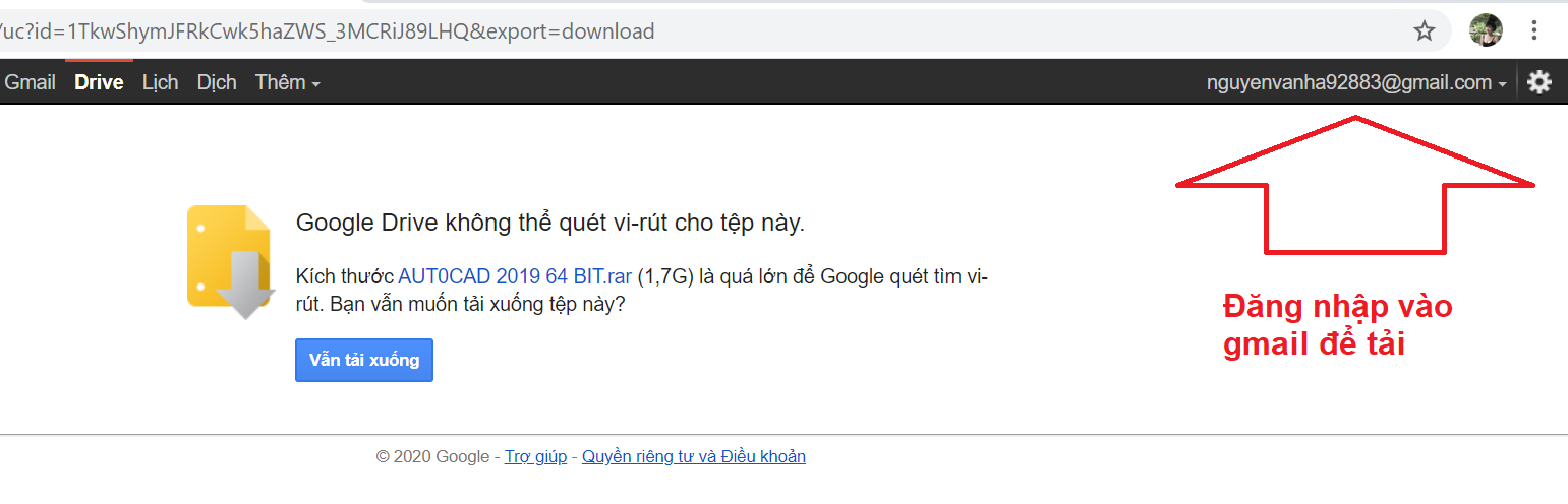 Khi bạn gặp thông báo như trên thì cách đơn giản nhất để khắc phục là đăng nhập vào gmail của bạn để tải.