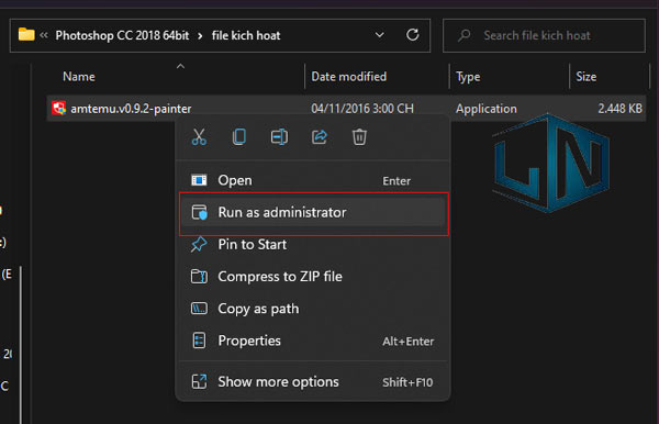 Bước 2: Click chuột phải vào file có tên amtemu, chọn Run as administrator.